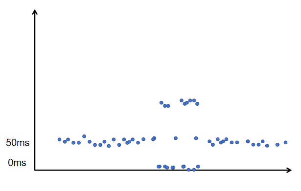 • 点基本沿一条水平带聚集,纵坐标在 ≈50 ms 附近,只有小抖动(比如 ±几 ms)。