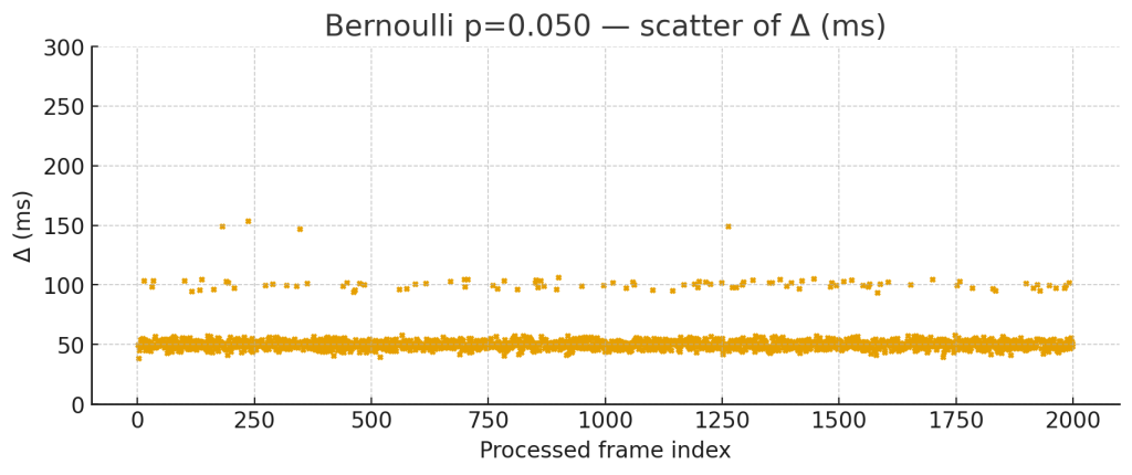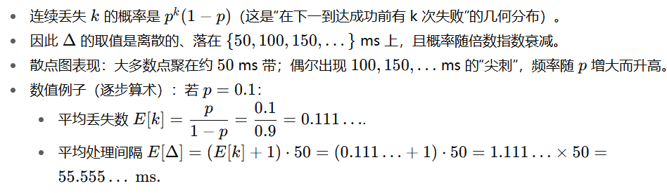 • 丢包事件在时间上近似为泊松过程时,丢包间隔(以帧数计)近似服从指数分布,故 Δ 的“倍数”出现间隔为指数分布——看起来是随机但孤立的尖刺(没有长簇)。和独立伯努利类似,但更侧重时间尺度建模。
