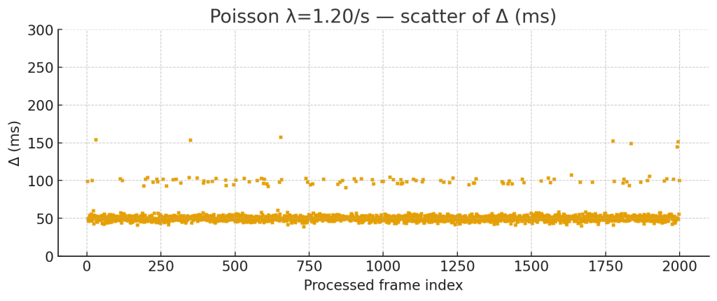 • 视觉印象:横轴上帧号连续,但点聚成“簇”:很多点靠近 0(短时间内快速处理多帧),簇与簇之间有较大的间隔/少数高位点(长等待)。