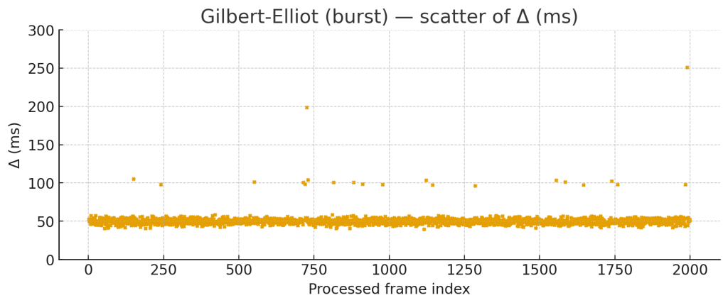 • 散点图表现:会看到较长且连续的高倍数尖刺(例如连续若干个很大的 Δ,对应多帧连续丢失),而且这些尖刺往往成簇出现(在一段时间内频繁大间隔),不是孤立的单个大尖刺。